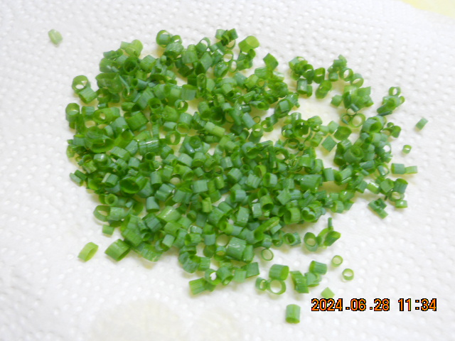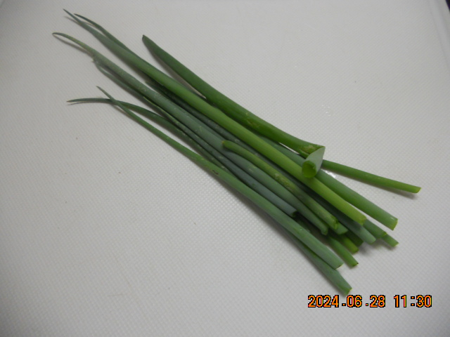 | 収穫した小ネギ 小口切りにする
